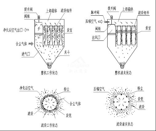 除塵器工作時,隨著過濾的不斷進行,濾袋外表的積塵逐漸增多,除塵器的阻力亦逐漸增加。當(dāng)達到設(shè)定值時,清灰控制器發(fā)出清灰指令,將濾袋外表面的粉塵清除下來,并落入灰斗,然后再打開排氣閥使該室恢復(fù)過濾。經(jīng)過適當(dāng)?shù)臅r間間隔后除塵器再次進行下一室的清灰工作。