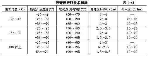 瀝青應(yīng)采用30 號(hào)甲建筑石油瀝青或30 甲與10 號(hào)建筑石油瀝青的混合物。將溫度在180~200℃的脫水瀝青逐漸加入干燥并預(yù)熱到120~140℃的高嶺土中,不斷攪拌,使其混合均勻。然后測(cè)定瀝青瑪?shù)壑能浕c(diǎn)、延伸度、針入度等三項(xiàng)技術(shù)指標(biāo),達(dá)到表1-41 中的規(guī)定時(shí)為合格。