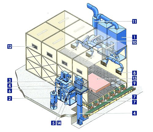 1、室體除塵器 2、分選除塵器 3、砂(丸)料斗 4、斗式提升機(jī) 5、一級(jí)分離器 6、壓送式噴砂機(jī) 7、輸送機(jī)構(gòu) 8、吸塵口 9、蜂窩地板料斗 10、大型風(fēng)機(jī) 11、消音器 12、進(jìn)風(fēng)口 13、地軌臺(tái)車 14、二級(jí)分離. |